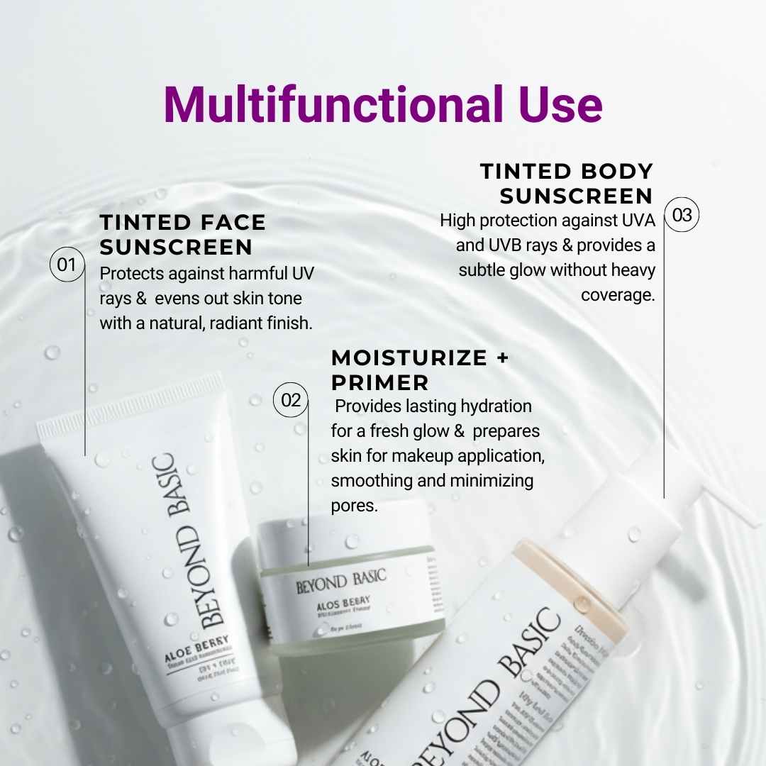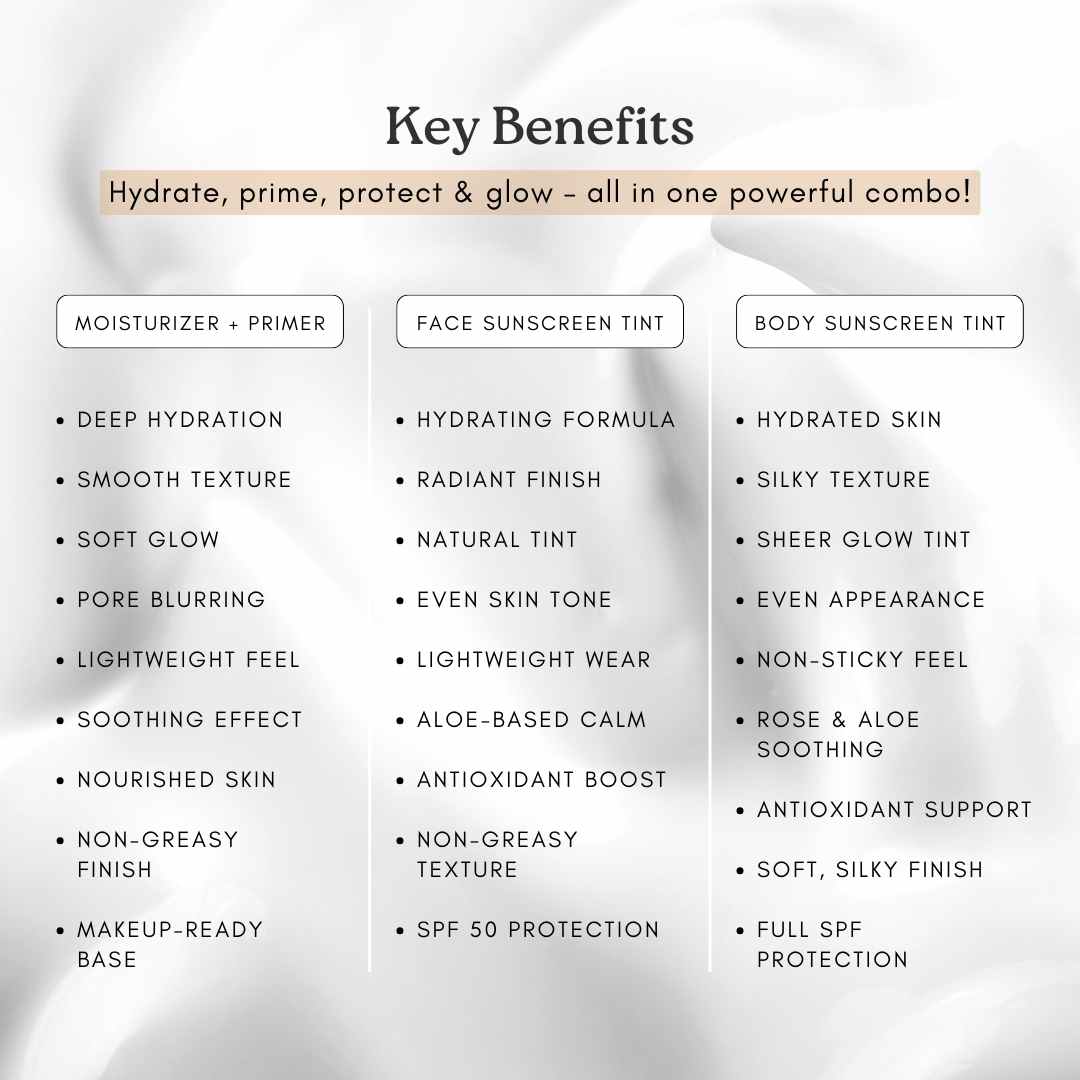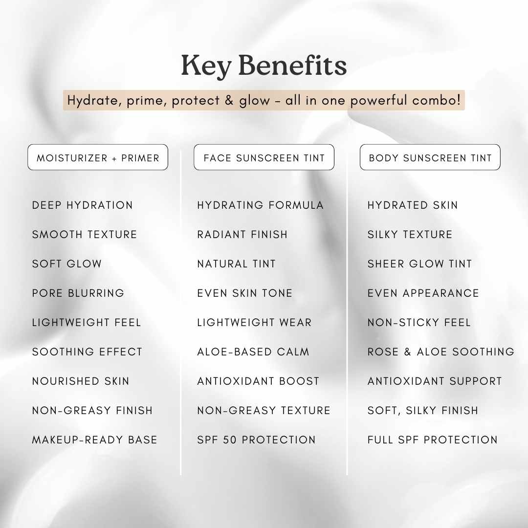 Meet the all-in-one skincare dream team—your Moisturizer + Primer, Tinted Face Sunscreen, and Tinted Body Sunscreen—crafted for effortless beauty with maximum impact.