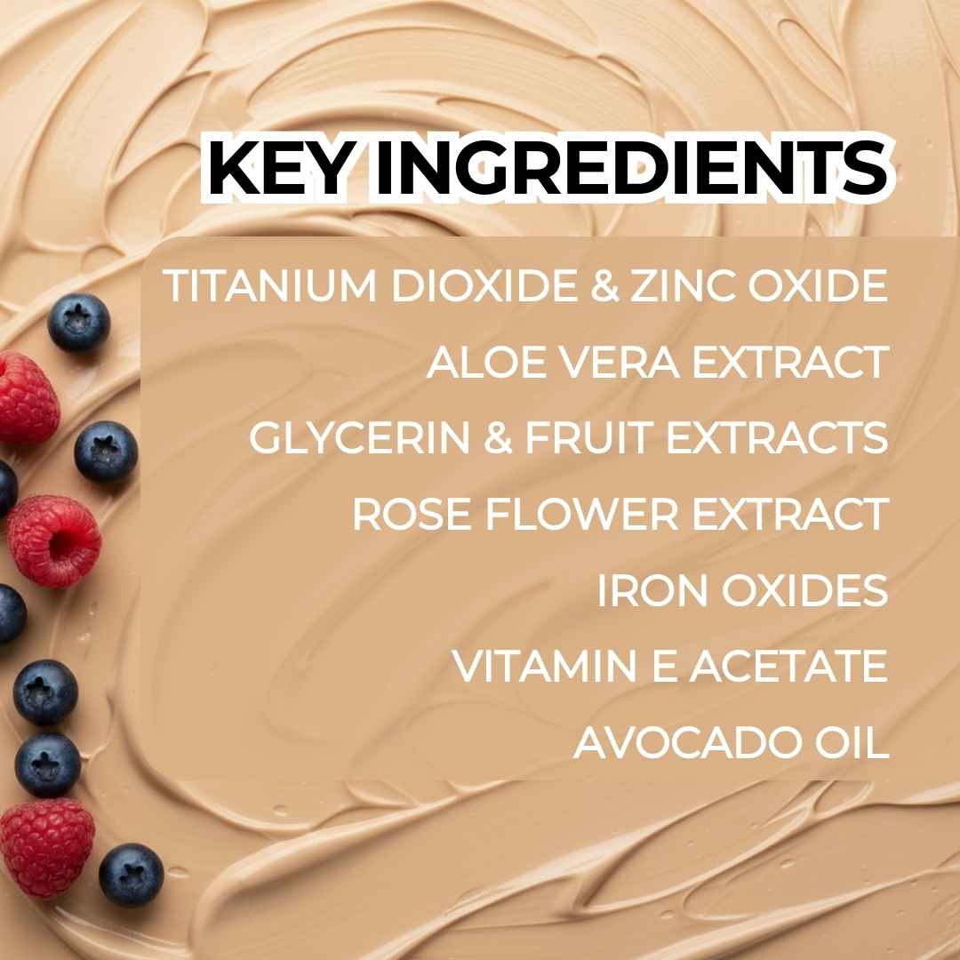 Body Sunscreen : Caprylyl Methicone and Dimethicone Crosspolymer, Octyl Methoxy Cinnamate, C12-15 Alkyl Benzoate, Dicaprylyl Carbonate, Myristyl Myristate & Ceteareth-12 & Cetearyl Alcohol & Glyceryl Stearate & Glycerin & Potassium Cetyl Phosphate, Methylene Bis-Benzotriazolyl Tetramethylbutylphenol & Aqua & Decyl Glucoside & Propylene Glycol & Xanthan Gum, Titanium Dioxide & Iron Oxides, Aloe Vera Extract, Glycerin & Fragaria Ananassa Fruit Extract & Rubus Idaeus Fruit Extract & Rubus Fruticosus Fruit Extract & Potassium Sorbate & Sodium Benzoate, Cetearyl Olivate & Sorbitan Olivate, Phenoxyethanol, Polyacrylate Crosspolymer-6, Vitamin E Acetate, Pentaerythrityl Tetra-Di-T-Butyl Hydroxyhydrocinnamate, Sodium Gluconate, Rose Flower Extract, Purified Water.